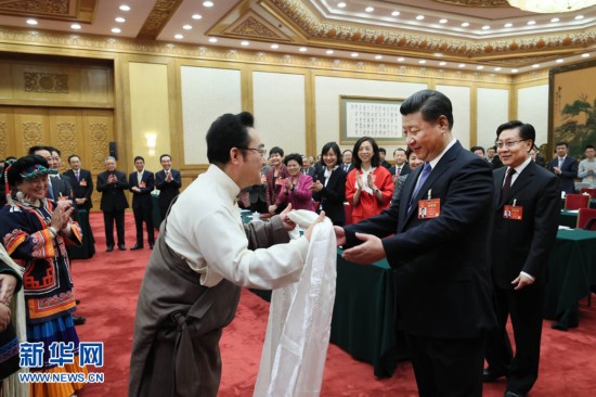 3月8日,中共中央總書記、國(guó)家主席、中央軍委主席習(xí)近平參加十二屆全國(guó)人大五次會(huì)議四川代表團(tuán)的審議。習(xí)近平走進(jìn)會(huì)場(chǎng)時(shí),身著民族服裝的藏族、彝族、羌族代表向總書記問好。這是藏族代表獻(xiàn)上潔白的哈達(dá)。新華社記者 蘭紅光 攝