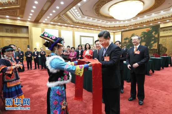 3月8日,中共中央總書記、國(guó)家主席、中央軍委主席習(xí)近平參加十二屆全國(guó)人大五次會(huì)議四川代表團(tuán)的審議。習(xí)近平走進(jìn)會(huì)場(chǎng)時(shí),身著民族服裝的藏族、彝族、羌族代表向總書記問好。這是羌族代表獻(xiàn)上鮮艷的羌紅。新華社記者 蘭紅光 攝