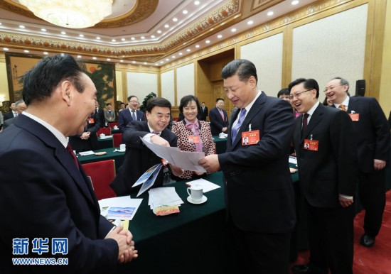 3月8日,中共中央總書記、國(guó)家主席、中央軍委主席習(xí)近平參加十二屆全國(guó)人大五次會(huì)議四川代表團(tuán)的審議。這是習(xí)近平同代表親切交流。新華社記者 蘭紅光 攝