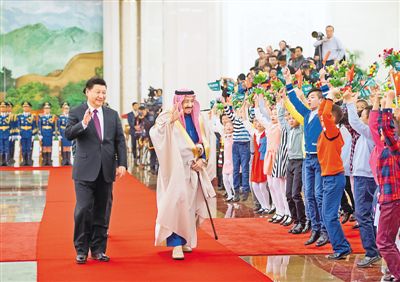 會談前,習(xí)近平在人民大會堂北大廳為薩勒曼舉行歡迎儀式。全國人大常委會副委員長陳竺、國務(wù)委員楊潔篪、全國政協(xié)副主席劉曉峰等出席。