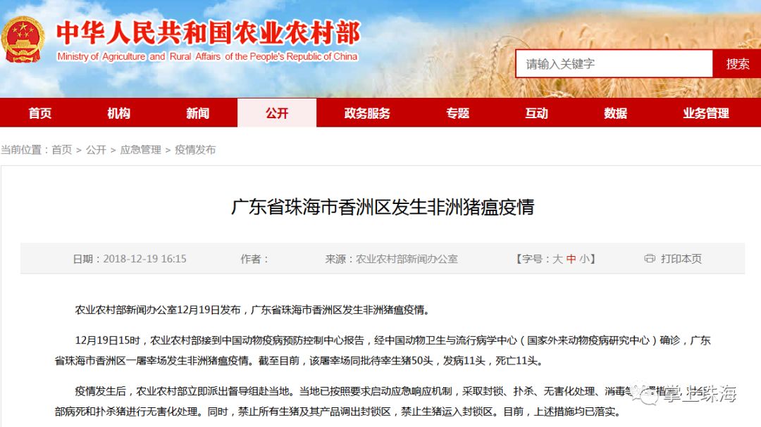 農(nóng)業(yè)農(nóng)村部新聞辦公室12月19日發(fā)布消息稱,廣東省珠海市香洲區(qū)排查出一起非洲豬瘟疫情,截至目前,同批待宰生豬50頭,發(fā)病11頭,死亡11頭。據(jù)悉,該疫情已得到有效處置,這是廣東主動(dòng)排查出的首例非洲豬瘟疫情。
