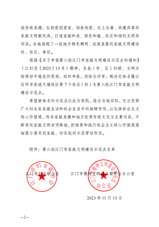 為深入貫徹落實(shí)習(xí)近平總書記關(guān)于注重家庭家教家風(fēng)建設(shè)的重要論述,使千千萬萬個(gè)家庭成為國家發(fā)展、民族進(jìn)步、社會和諧的重要基點(diǎn),百合鎮(zhèn)委高度重視,把家庭文明建設(shè)納入本鎮(zhèn)精神文明建設(shè)總體規(guī)劃,積極開展家庭文明創(chuàng)建實(shí)踐活動。11月15日,百合鎮(zhèn)儒東村被江門市婦聯(lián)、江門市文明辦命名為第六批江門市家庭文明建設(shè)示范點(diǎn),是開平市唯一獲評示范點(diǎn)的鎮(zhèn)村。