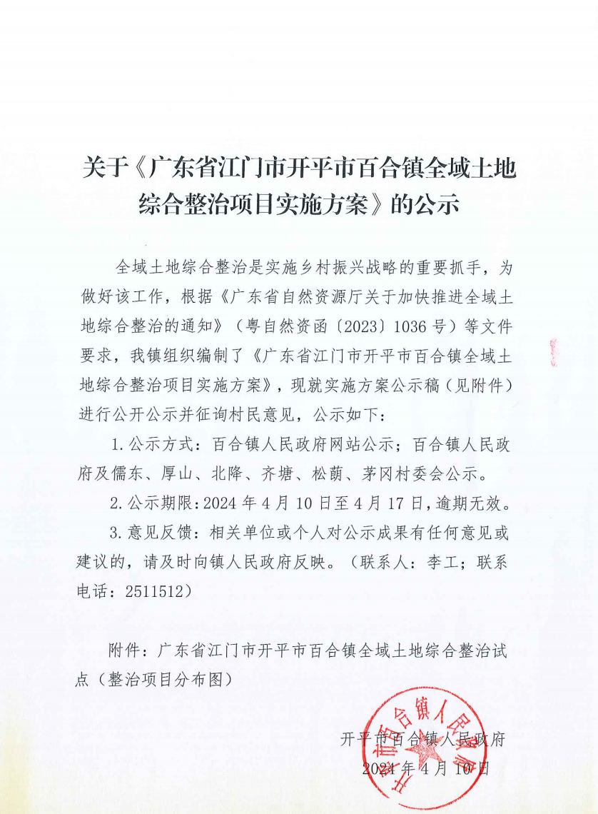 關(guān)于《廣東省江門市開平市百合鎮(zhèn)全域土地綜合整治項(xiàng)目實(shí)施方案》的公示