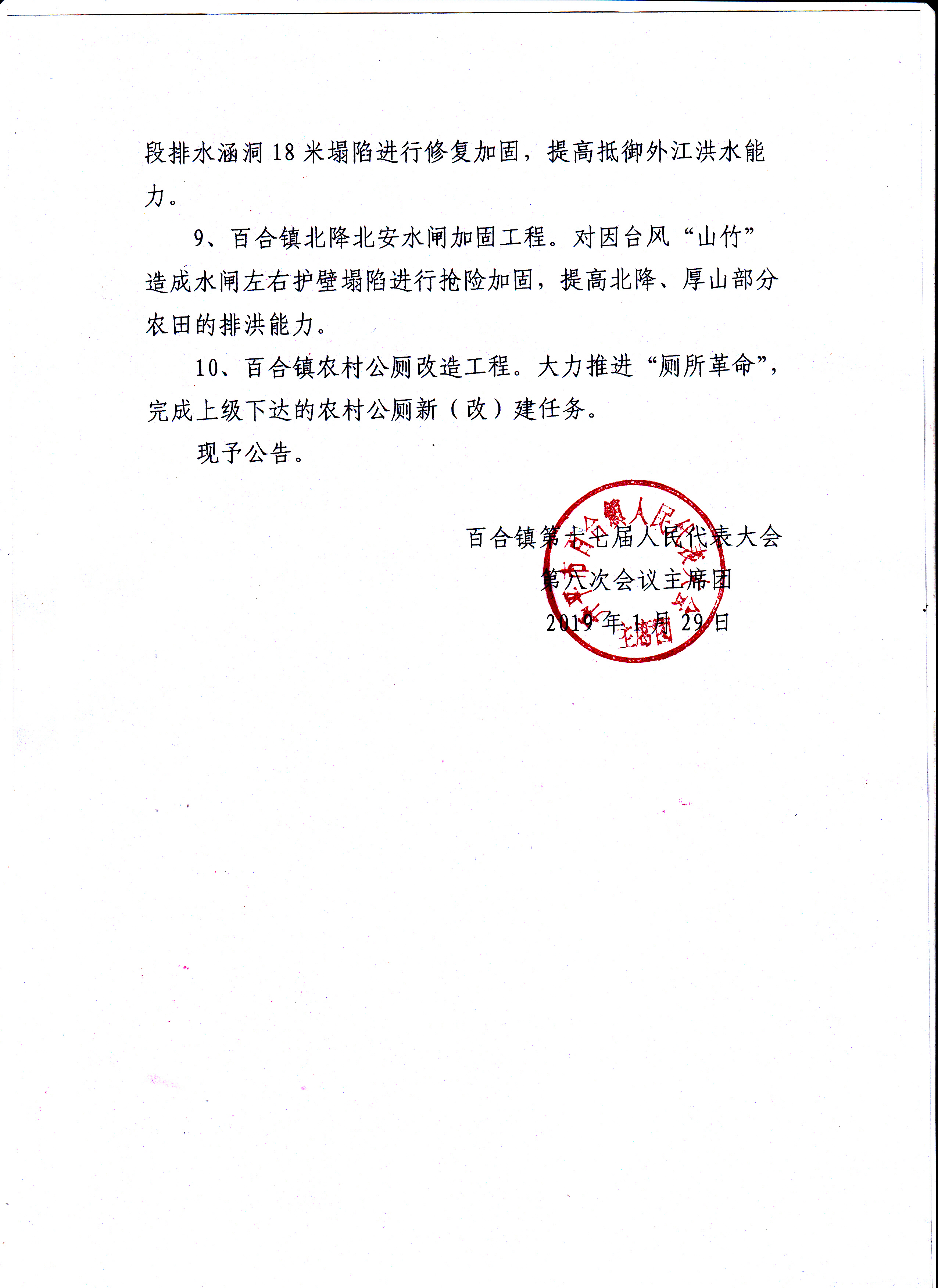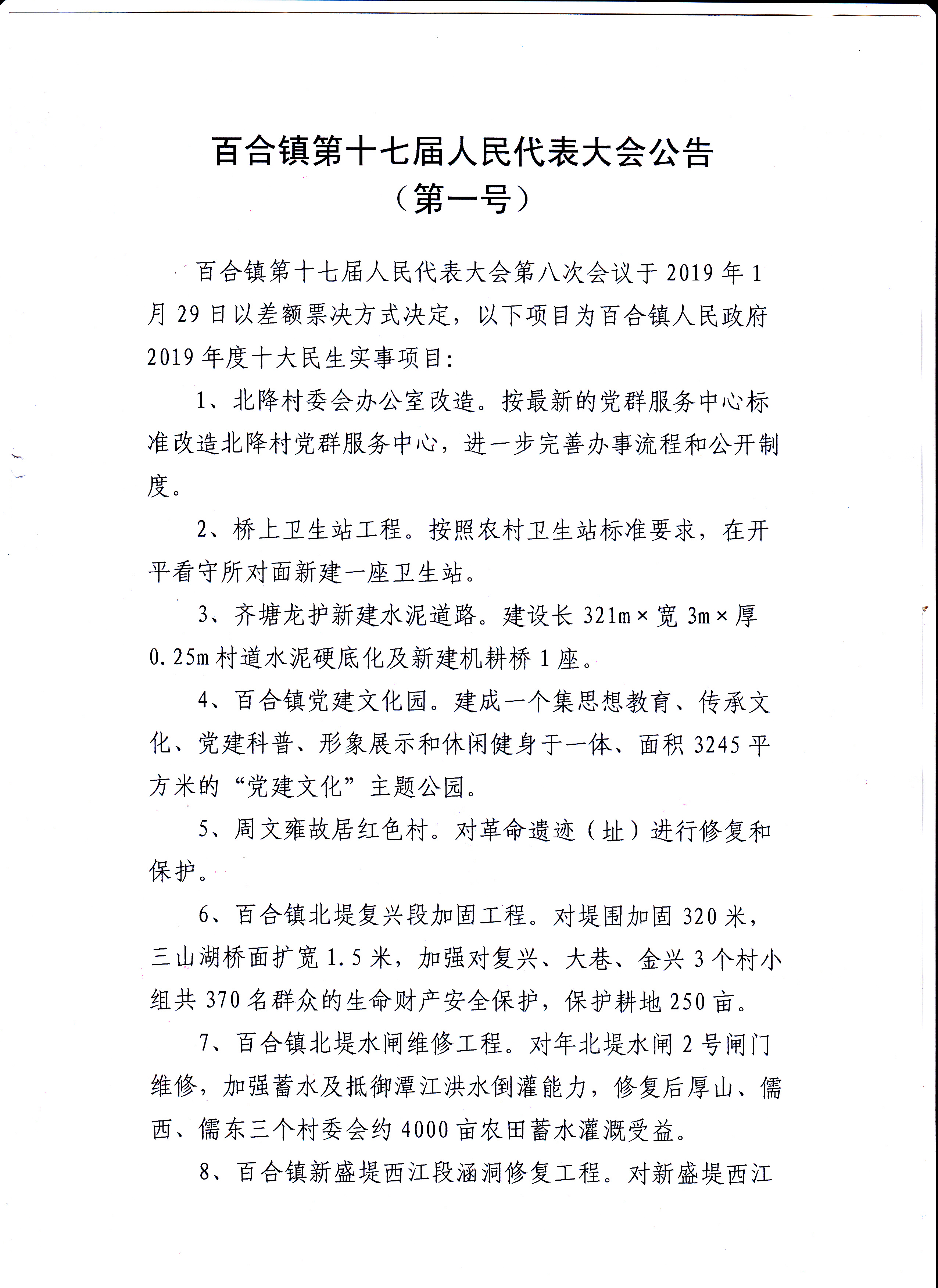 百合鎮(zhèn)第十七屆人民代表大會公告(第一號)