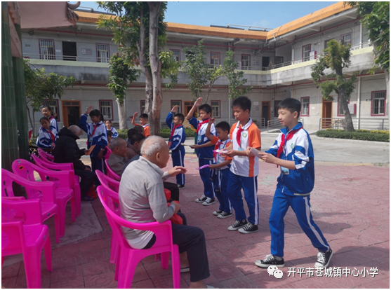金秋十月爽,九九話重陽(yáng),日月兩重歸,相印地久長(zhǎng)。為弘揚(yáng)中華民族尊老、愛(ài)老、敬老的優(yōu)秀傳統(tǒng)美德,在重陽(yáng)節(jié)之際,蒼城鎮(zhèn)中心小學(xué)開展重陽(yáng)節(jié)敬老愛(ài)老慰問(wèn)活動(dòng)。 2020年10月21日星期三上午,蒼城鎮(zhèn)中心小學(xué)的15名少先隊(duì)大隊(duì)委員在譚子龍主任、張惠屏輔導(dǎo)員老師、梁彩霞老師的帶領(lǐng)下,踏著輕快的步伐走進(jìn)了蒼城敬老院,提前陪老人們歡度重陽(yáng)佳節(jié)。 來(lái)到敬老院,隊(duì)員們有的拿起掃把在敬老院里外打掃起來(lái);有的幫忙拔掉地面的雜草;有的幫忙搬椅子出來(lái)給爺爺奶奶們坐。 接著,隊(duì)員們紛紛為老人送上祝福、送上禮品與親手制作的賀卡,還與老人們交流談心。老人們拉著孩子們的手,用最樸實(shí)、最善良的祝福表達(dá)他們的心意,整個(gè)敬老院氣氛其樂(lè)融融,很是熱鬧。 少先隊(duì)大隊(duì)長(zhǎng)謝穎琳、副大隊(duì)長(zhǎng)梁嵐香和張梓鴻為行動(dòng)不 便的公公婆婆送上禮品、賀卡和節(jié)日的慰問(wèn)。 輔導(dǎo)員張惠屏老師送上慰問(wèn)金。 通過(guò)重陽(yáng)節(jié)敬老愛(ài)老活動(dòng)的開展,學(xué)生們了解到老年人更需要關(guān)愛(ài)、需要快樂(lè)和健康,尊老、敬老、愛(ài)老的傳統(tǒng)美德在大家心中深深地生根發(fā)芽,并將這絢麗的道德之花傳承下去。