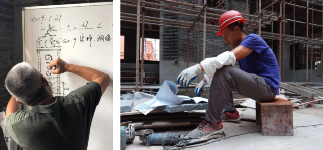 但是,我們沒有按套路來。如果說2019年1月31日主體結(jié)構(gòu)封頂前仍然是按圖施工的話,那2019年4月份建筑立面施工團(tuán)隊(duì)進(jìn)場(chǎng)后,一切開始走向無圖化。在施工開展后,當(dāng)?shù)厮囆g(shù)家和工匠團(tuán)隊(duì)積極合作,在管理團(tuán)隊(duì)的激勵(lì)下,激發(fā)了現(xiàn)場(chǎng)施工團(tuán)隊(duì)的創(chuàng)作熱情,而建筑師則被徹底擠壓到了創(chuàng)作這件事的邊緣地帶,在我們?cè)O(shè)計(jì)團(tuán)隊(duì)看來,這無異于現(xiàn)場(chǎng)徹底“失控”。