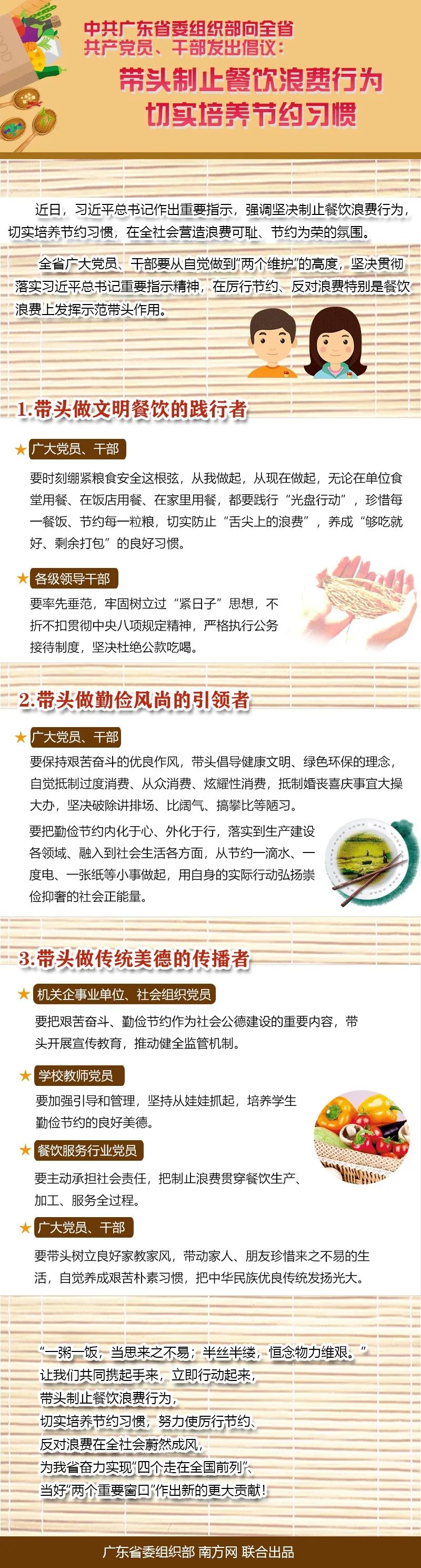 關(guān)于“餐飲浪費”現(xiàn)象作出的重要指示精神,進一步弘揚中華民族勤儉節(jié)約的傳統(tǒng)美德,牢固樹立節(jié)約光榮、浪費可恥意識。廣東省委組織部向全省黨員干部發(fā)出倡議,一起來看全文內(nèi)容。