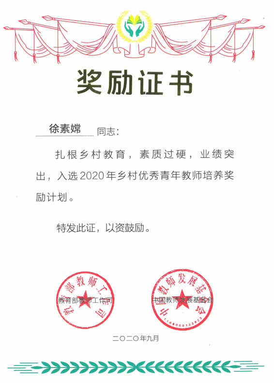 近日,教育部教師工作司、中國教師發(fā)展基金公布了2020年鄉(xiāng)村優(yōu)秀青年教師培養(yǎng)獎勵計(jì)劃人選,全國各省市共有310人入選,開平市第一中學(xué)地理科徐素嫦老師成為江門市唯一入選名單,獲得1萬元獎勵并入選教育部教師工作司實(shí)施的名師領(lǐng)航工程,納入名師工作室進(jìn)行培養(yǎng)。同時,廣東省教育廳也將入選的鄉(xiāng)村優(yōu)秀青年教師納入骨干教師、名師培養(yǎng)序列,予以重點(diǎn)支持和培訓(xùn)。