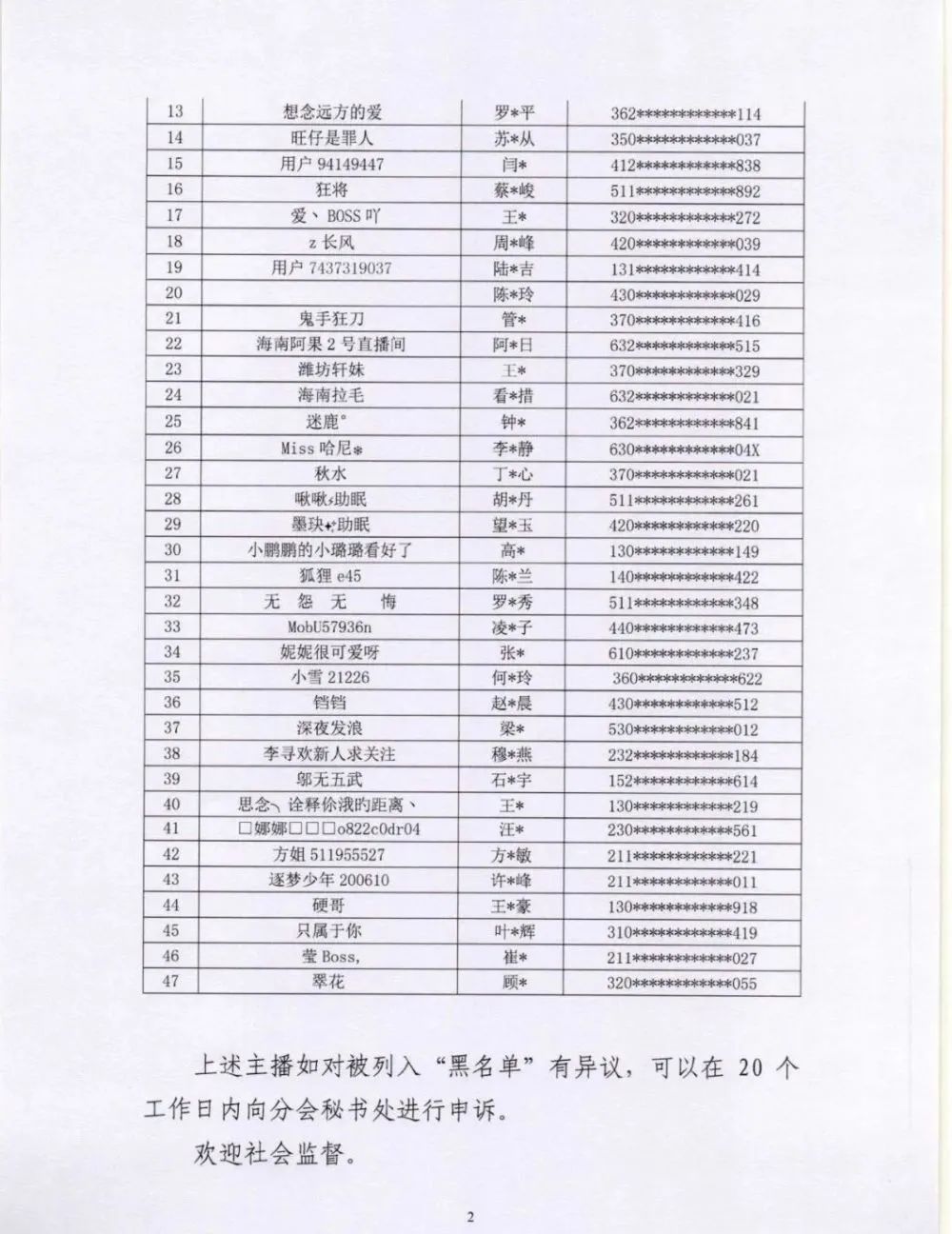 中國演出行業(yè)協(xié)會(huì)網(wǎng)絡(luò)表演(直播)分會(huì)透露,根據(jù)《互聯(lián)網(wǎng)文化管理暫行規(guī)定》《網(wǎng)絡(luò)表演經(jīng)營活動(dòng)管理辦法》《互聯(lián)網(wǎng)直播服務(wù)管理規(guī)定》等相關(guān)法律法規(guī),按照《網(wǎng)絡(luò)表演(直播)行業(yè)主播“黑名單”管理制度》《黑名單認(rèn)定工作流程》規(guī)定,向社會(huì)公布第七批主播黑名單,47名被列入黑名單的主播將在行業(yè)內(nèi)禁止注冊和直播,封禁期限5年。