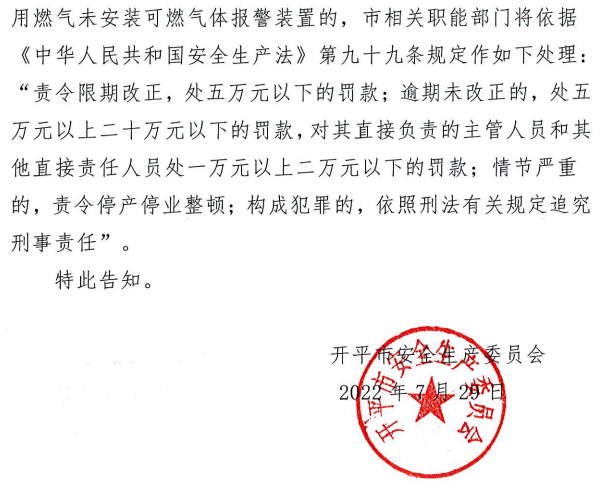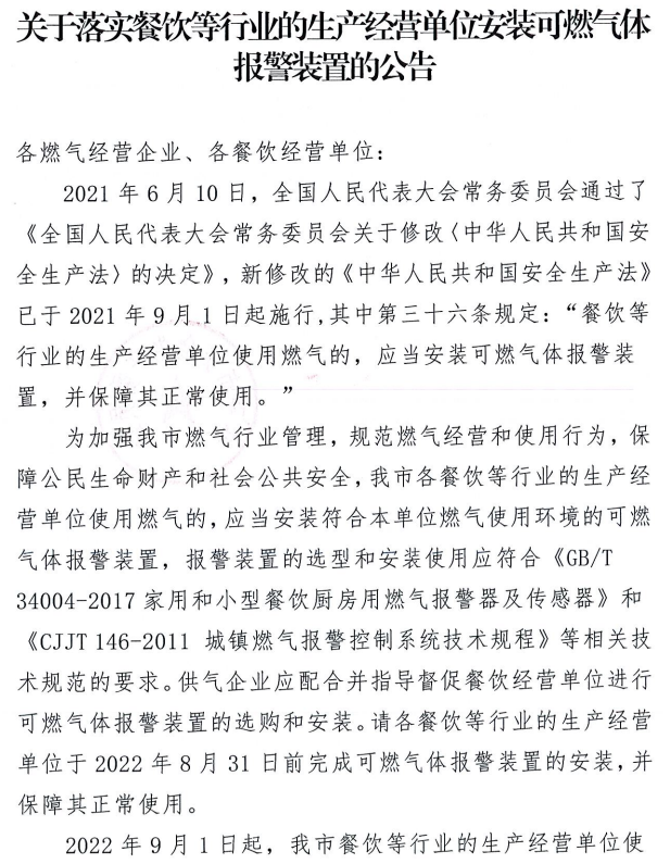 關于落實餐飲等行業(yè)的生產經營單位安裝可燃氣體報警裝置的公告