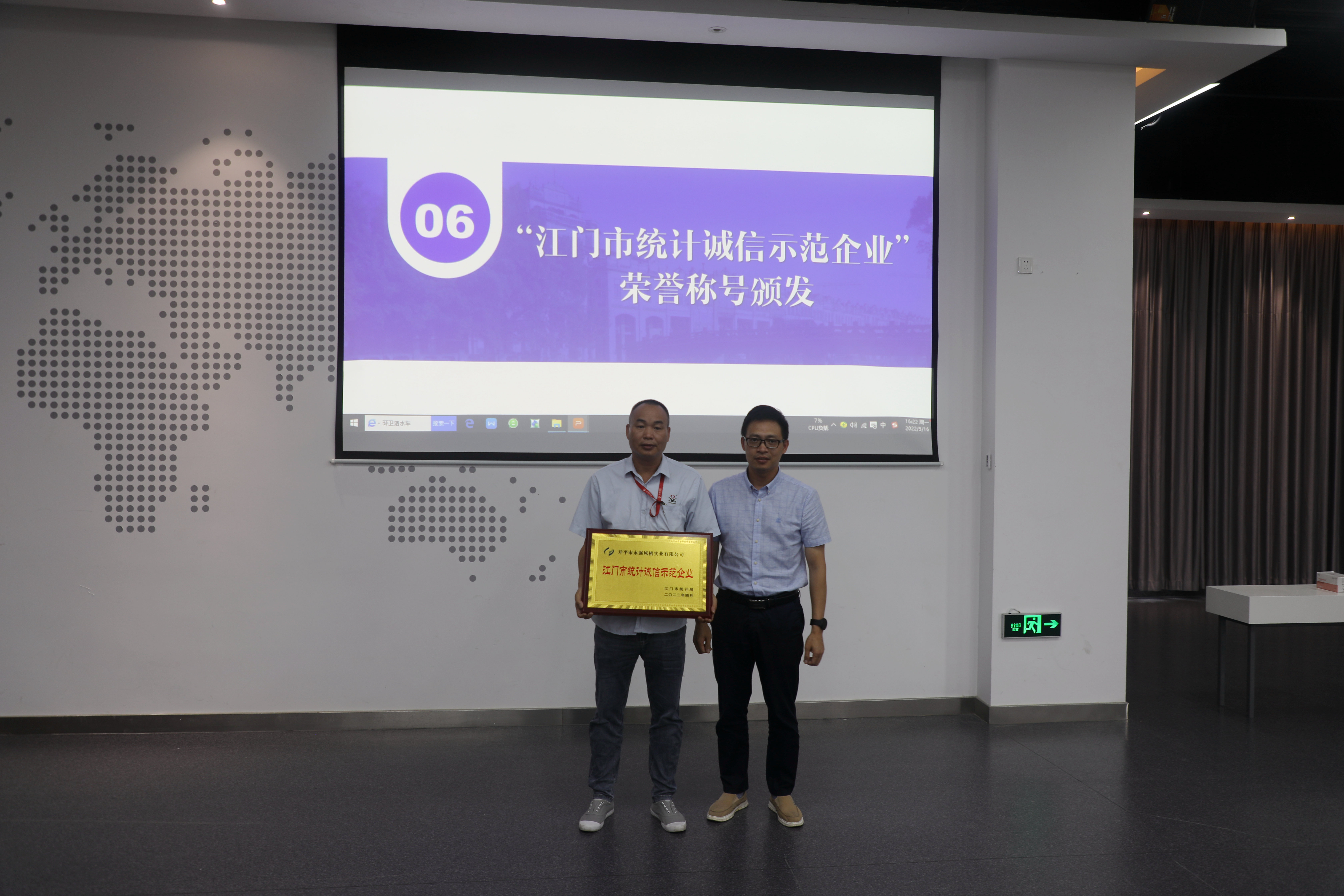 ▲赤坎鎮(zhèn)副鎮(zhèn)長許源景為江門市統(tǒng)計誠信示范企業(yè)頒獎