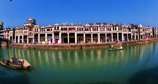 赤坎沿潭江而建,南岸是鄉(xiāng)村,北岸則是城市,清一色的騎樓,遠(yuǎn)比開平老街龐大的洋樓群。沿江的堤東堤西路,里面與之平行的中華路,夾在兩條大路間還有一條叫“二馬路”的小路,這是與江平行的三橫,還有許多縱馬路與它們交叉形成城區(qū)的路網(wǎng)。赤坎鎮(zhèn)有一番中西合璧的古樸味道。因此有“中國第五名古鎮(zhèn)”之稱