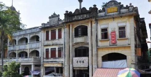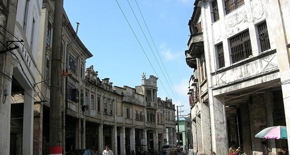 赤坎鎮(zhèn)的堤西路被譽(yù)為歐陸風(fēng)情街,沿路商鋪建筑風(fēng)格保存良好,充滿1920年代的味道。早年旅美、歐的本地華僑帶回國外建筑圖紙?jiān)偃诤媳镜貍鹘y(tǒng)建筑風(fēng)格,建造出一批中西合璧的樓房。其特色主要體現(xiàn)在樓頂建筑。