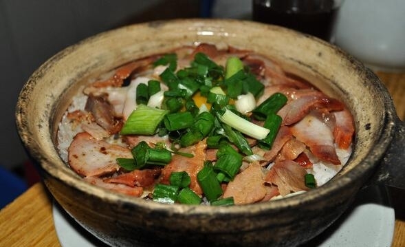 煲仔飯是廣東城鄉(xiāng)隨處可見的食品,但赤坎款式最多,味道最濃,制法最巧妙,風(fēng)味最獨(dú)特,是廣式煲仔飯中最地道的。吃煲仔飯,要到赤坎,到赤坎,不可不吃煲仔飯。赤坎的開平巷煲仔飯店又多又集中,經(jīng)營各種煲仔飯的餐館沿巷一字排開,有臘腸飯、臘肉飯、臘鴨飯、黃鱔飯、塘虱飯、鰍魚飯、滑雞飯、田雞飯、牛肉飯、海鮮飯等,每到開飯時(shí)間,檔檔各出奇招招徠食客,吆喝聲、招呼聲不斷,場面非常熱鬧,經(jīng)常是座無虛席。這些飯店門前均擺開十幾個(gè)爐火熊熊的爐子,各種餡料擺在門口臺(tái)子上,任人選擇,即點(diǎn)即煮,當(dāng)面烹調(diào),絕無虛假??粗箪易酗垼扔诳此囆g(shù)表演,師傅在幾十個(gè)爐前左右騰挪,雙手上下翻飛,不停翻動(dòng)煲蓋,下米、放水、放肉類、放蔥花芫荽,操作有條不紊,快而不亂,令人嘆為觀止。
