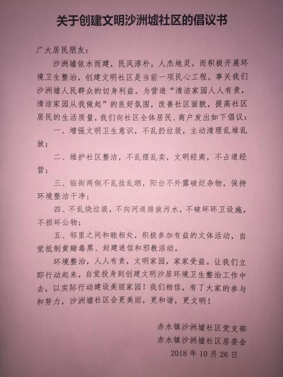 活動中,黨員們還向群眾派發(fā)了《創(chuàng)建文明沙洲墟社區(qū)倡議書》,向群眾宣傳維護環(huán)境衛(wèi)生舉措,增強群眾環(huán)境保潔意識,形成長效機制。