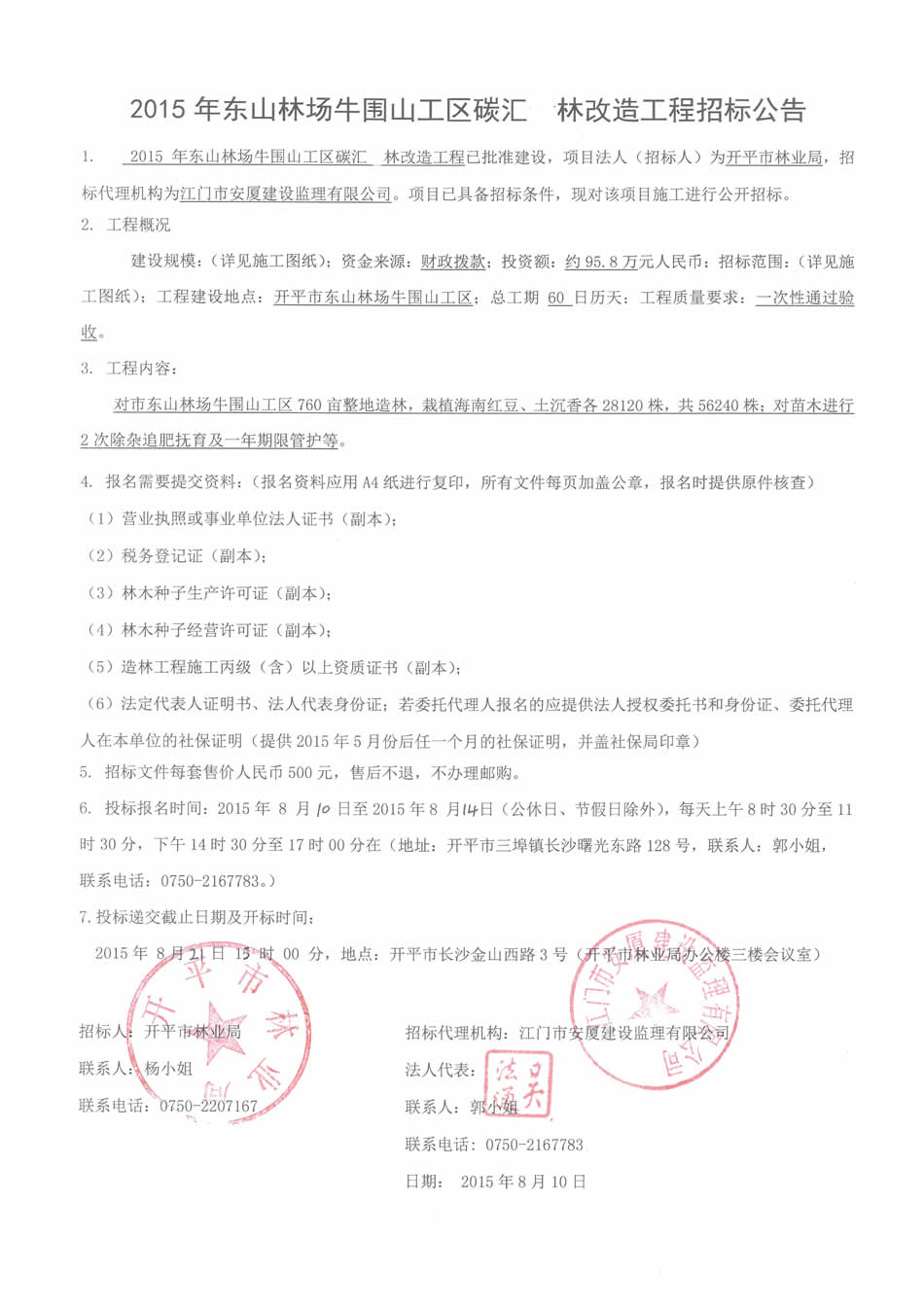 2015年東山林場牛圍山工區(qū)碳匯林改造工程招標(biāo)公告