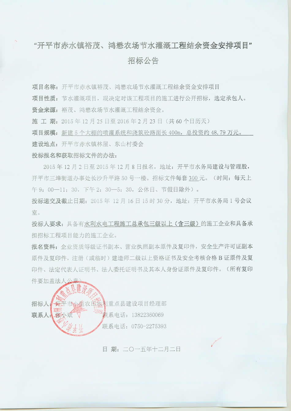 “開平市赤水鎮(zhèn)裕茂、鴻懋農(nóng)場節(jié)水灌溉工程結(jié)余資金安排項(xiàng)目”招標(biāo)公告