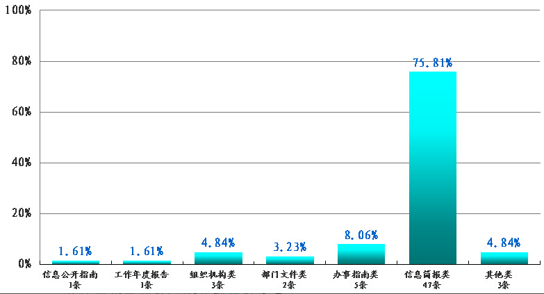2015年,赤水鎮(zhèn)政府門戶網(wǎng)站共發(fā)布政府各類信息62條,其中政府信息公開指南1條,占1.61%;政府信息公開工作年度報告1條,占1.61%;組織機構(gòu)類信息3條,占4.84%;部門文件類信息2條,占3.23%;辦事指南類信息5條,占8.06%;信息簡報類信息47條,占75.81%;其它類信息3條,占4.84%(見圖3)。群眾可通過赤水鎮(zhèn)政府網(wǎng)站的“信息動態(tài)”等欄目查閱檢索相關(guān)政府信息。