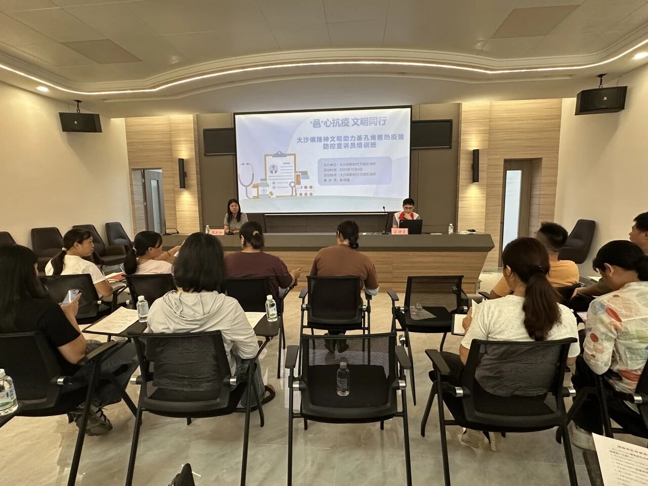 為進(jìn)一步提升廣大干部群眾疫情防控意識(shí),掌握疫情防控知識(shí),形成疫情防控自覺(jué),大沙鎮(zhèn)新時(shí)代文明實(shí)踐所協(xié)同鎮(zhèn)各文明實(shí)踐站組建鎮(zhèn)村兩級(jí)防疫宣講團(tuán),并于10月4日舉辦精神文明助力基孔肯雅熱疫情防控宣講培訓(xùn)班,進(jìn)一步提升宣講員宣講能力水平。鎮(zhèn)黨委委員周冰如主持培訓(xùn)。