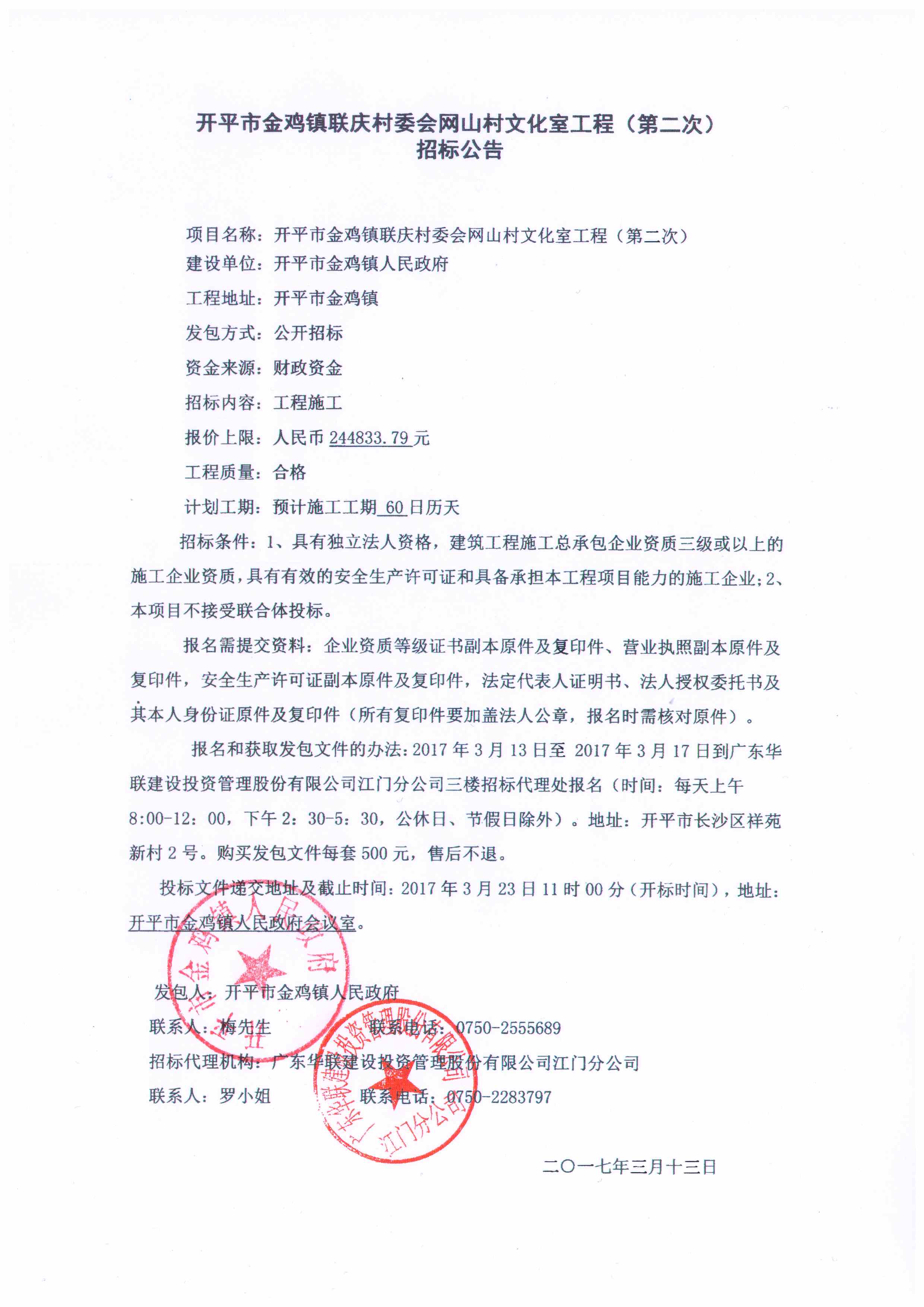 開平市金雞鎮(zhèn)聯(lián)慶村委會(huì)網(wǎng)山村文化室工程(第二次)