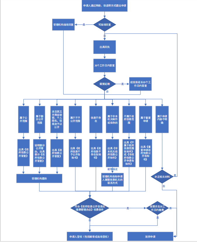 對于能夠當(dāng)場答復(fù)的政府信息公開申請,將當(dāng)場答復(fù);不能當(dāng)場答復(fù)的,自收到申請之日起20個工作日內(nèi)予以答復(fù);確需延長答復(fù)期限的,經(jīng)政府信息公開工作機(jī)構(gòu)負(fù)責(zé)人同意,延長答復(fù)時間不超過20個工作日,并告知申請人。《條例》另有規(guī)定的,從其規(guī)定。本機(jī)關(guān)征求第三方和其他機(jī)關(guān)意見所需時間不計算在前款規(guī)定的期限內(nèi)。