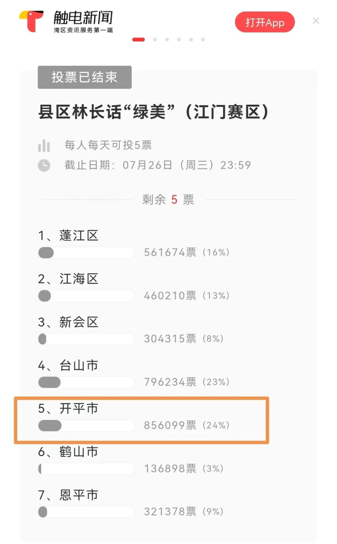 10月10日 “綠美廣東競風(fēng)華”(江門賽區(qū)) 海選賽圓滿收官 開平市榮獲第一名 將代表江門市參加珠三角核心區(qū)片區(qū)決賽 本次活動(dòng)以綠美江門生態(tài)建設(shè)為主題,由廣東省林業(yè)局、廣東廣播電視臺(tái)、江門市人民政府主辦,廣東省林業(yè)事務(wù)中心、廣東廣播電視臺(tái)珠江頻道、江門市林長辦、江門市自然資源局(江門市林業(yè)局)、江門市廣播電視臺(tái)承辦。 在活動(dòng)現(xiàn)場,江門賽區(qū)7個(gè)縣(市、區(qū))的第一林長或林長依次上臺(tái),結(jié)合PPT(視頻)現(xiàn)場演講、抽題作答、評審團(tuán)提問等,介紹2023年綠美縣區(qū)建設(shè)規(guī)劃和工作亮點(diǎn),分享交流各地在創(chuàng)新造林綠化機(jī)制、推動(dòng)城市公園建設(shè)、推動(dòng)全民愛綠植綠護(hù)綠興綠行動(dòng)等方面的經(jīng)驗(yàn)實(shí)踐和思路舉措。經(jīng)過激烈角逐,開平市以總分963分脫穎而出,獲評一等獎(jiǎng),將代表江門參加珠三角核心區(qū)片區(qū)決賽,展現(xiàn)綠美廣東生態(tài)建設(shè)的“江門答卷”。 據(jù)悉,“綠美廣東競風(fēng)華”大型主題活動(dòng)以全省21個(gè)地市、122個(gè)縣(市、區(qū))為參賽主體,通過21地市海選初賽、“珠三角核心區(qū)、沿海經(jīng)濟(jì)帶、北部生態(tài)發(fā)展區(qū)”片區(qū)競賽、“十強(qiáng)”風(fēng)華展演等3個(gè)階段,“綠野尋蹤、林間放大鏡、智慧造林、為未來充‘植’、公布網(wǎng)絡(luò)人氣投票及實(shí)地評估分?jǐn)?shù)”5個(gè)環(huán)節(jié),賽出“首屆綠美廣東競風(fēng)華全省十強(qiáng)”。 活動(dòng)自啟動(dòng)以來,開平市積極謀劃,拍攝錄制了《縣區(qū)林長話“綠美”——開平篇》短視頻。7月下旬,短視頻在廣東鄉(xiāng)村振興融媒中心各平臺(tái)、廣東廣播電視臺(tái)珠江頻道等各大媒體平臺(tái)同步展播并開啟網(wǎng)絡(luò)投票,我市紛紛發(fā)動(dòng)廣大市民投票打call,短短10天收到了85.6萬票。 一直以來,開平市深入學(xué)習(xí)貫徹習(xí)近平生態(tài)文明思想,大力實(shí)施省委綠美廣東“六大行動(dòng)”,以項(xiàng)目化方式細(xì)化為54個(gè)重點(diǎn)項(xiàng)目扎實(shí)推進(jìn),統(tǒng)籌投入各級資金超10億元,全面提升發(fā)展“含綠量”“含金量”。2022年林長制考核排名江門第一。