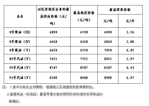 根據(jù)國(guó)家成品油價(jià)格形成機(jī)制,結(jié)合近一段時(shí)期國(guó)際市場(chǎng)油價(jià)變化情況,國(guó)家發(fā)展改革委決定自2016年12月14日24時(shí)起提高國(guó)內(nèi)成品油價(jià)格,即在現(xiàn)行價(jià)格的基礎(chǔ)上,汽、柴油價(jià)格每噸分別提高435元和420元。這次成品油價(jià)格調(diào)整后,我省國(guó)V標(biāo)準(zhǔn)92號(hào)汽油從6.08元/升提高到6.43元/升,每升提高0.35元;國(guó)V標(biāo)準(zhǔn)95號(hào)汽油從6.59元/升提高到6.97元/升,每升提高0.38元;國(guó)V標(biāo)準(zhǔn)0號(hào)柴油從5.66元/升提高到6.02元/升,每升提高0.36元。