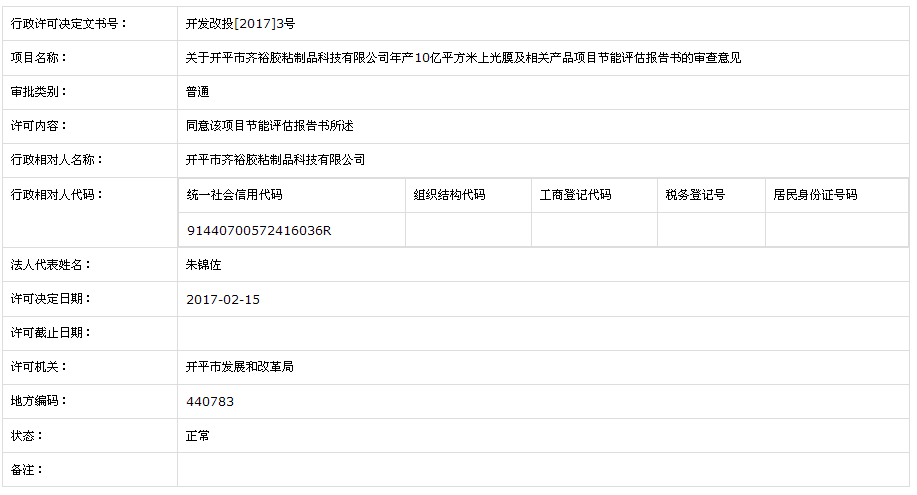 關(guān)于開平市齊裕膠粘制品科技有限公司年產(chǎn)10億平方米上光膜及相關(guān)產(chǎn)品項(xiàng)目節(jié)能評估報(bào)告書的審查意見