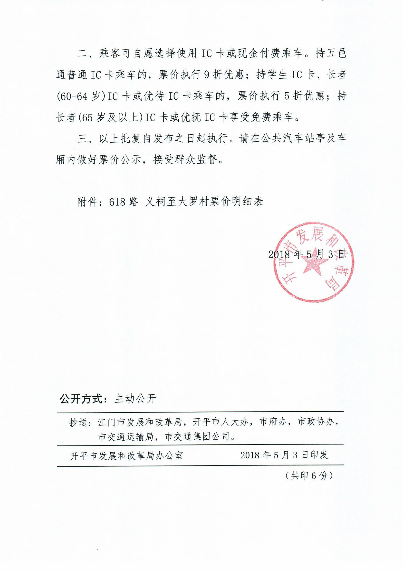 (開發(fā)改價管〔2018〕8號)關于618路公交線路票價調整的批復