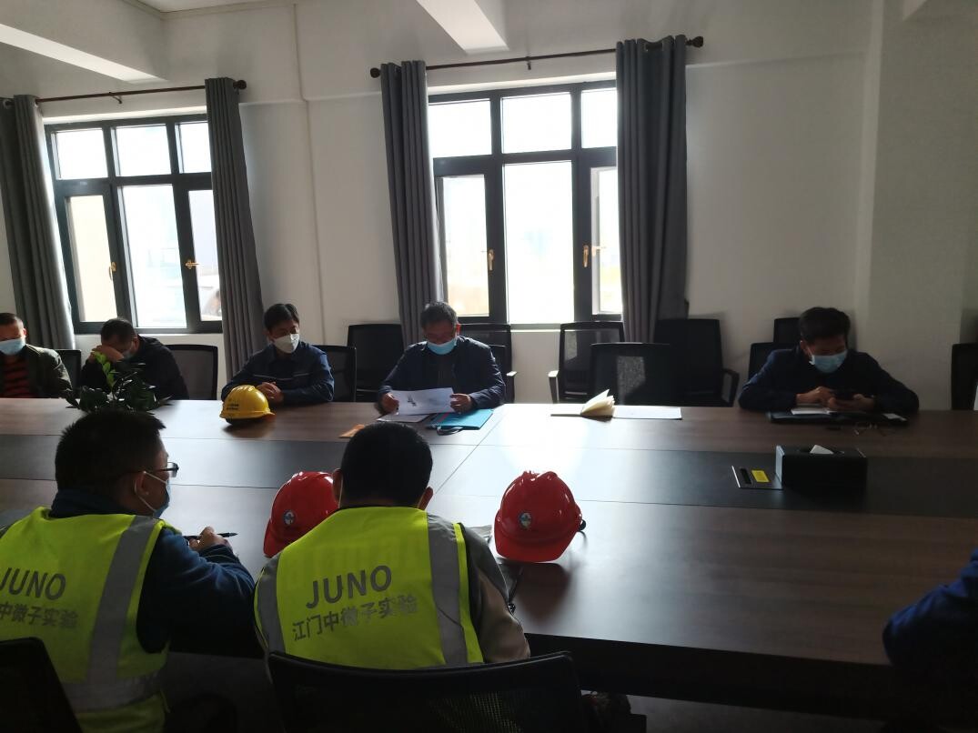 檢查組各成員單位按照各自職能,深入項目施工現(xiàn)場,對安全生產各項工作開展了認真細致的檢查?,F(xiàn)場檢查結束后,在江門中微子實驗室會議室召開現(xiàn)場會議。檢查組各成員單位對各自發(fā)現(xiàn)的安全隱患問題進行一一反饋,提出了合理化建議,項目建設單位、施工單位也作了表態(tài)發(fā)言。