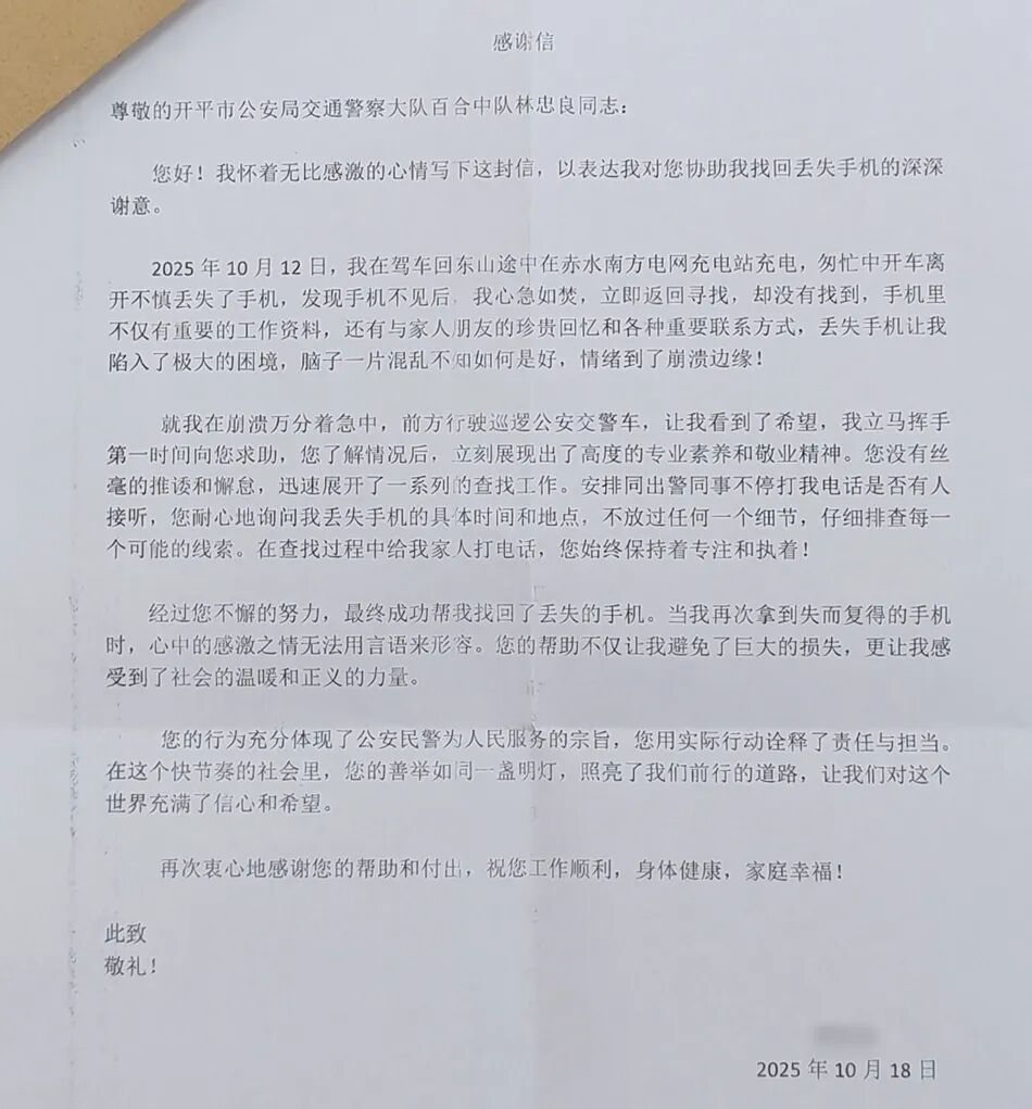 近日,譚女士帶著一面印有“一心為民尋失物 神速破案解民憂”的錦旗及一封感謝信,來到開平公安交管大隊(duì)百合中隊(duì),感謝民警幫助她找回存有重要信息的手機(jī)。