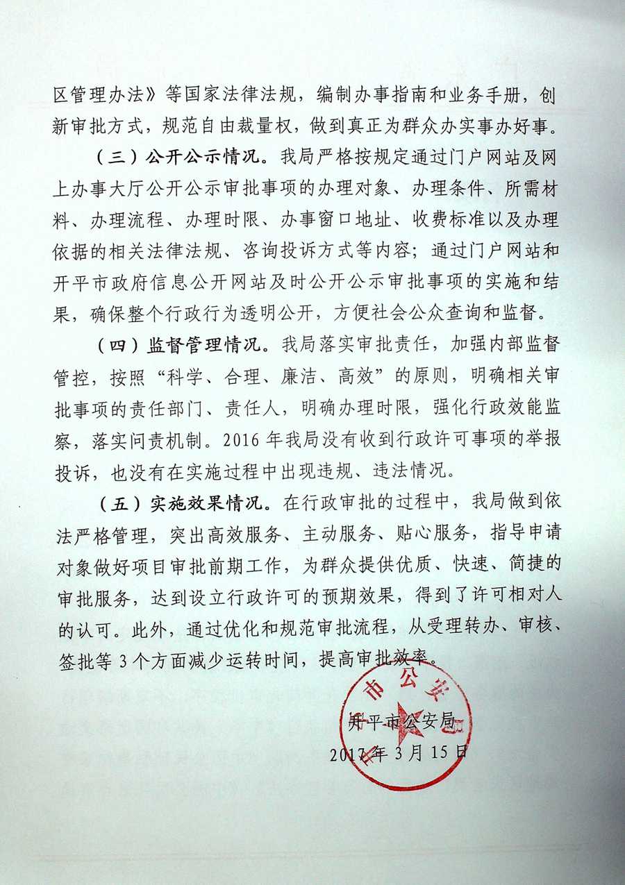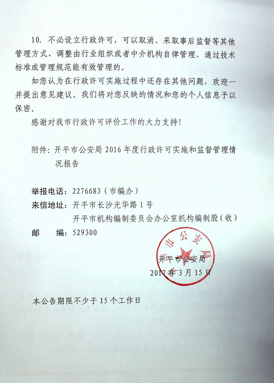 開平市公安局2016年度行政許可實施和監(jiān)督管理情況評價公告