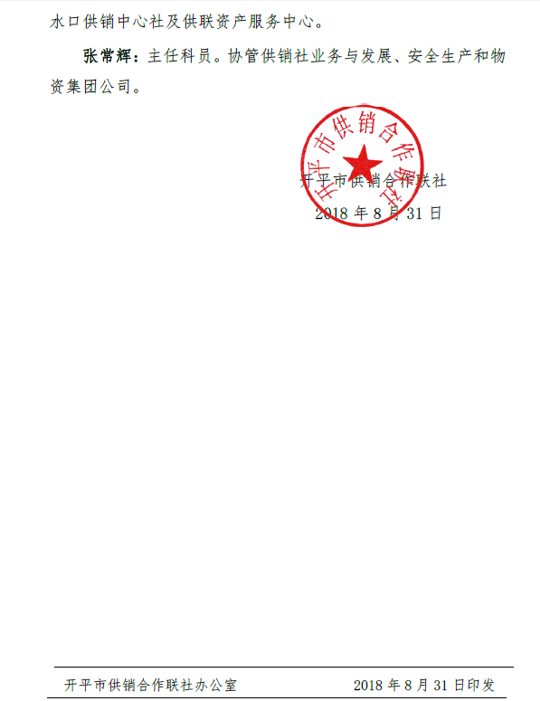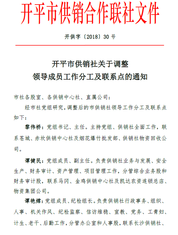 開供字〔2018〕30號(hào)開平市供銷社關(guān)于調(diào)整領(lǐng)導(dǎo)分工及聯(lián)系點(diǎn)的通知