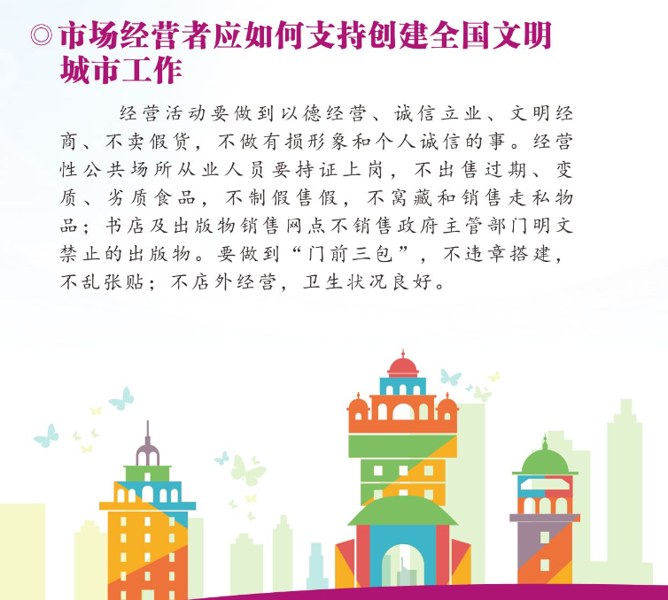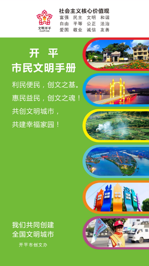 今年是開平市創(chuàng)建全國(guó)文明城市提名城市的大考年為進(jìn)一步營(yíng)造“人人知曉文明創(chuàng)建、人人參與文明創(chuàng)建、人人共享文明成果”的濃厚氛圍我們有《致開平全體市民的一封信》和《開平市民文明手冊(cè)》請(qǐng)大家記得簽收!爭(zhēng)當(dāng)文明人 共建文明城——致開平全體市民的一封信親愛的市民朋友們: 也許大家生活經(jīng)歷都不盡相同,興趣愛好也不一致。但是,我們都有一個(gè)共同的稱謂——開平市民:都有一個(gè)共同的心愿一一生活幸福指數(shù)不斷提高。而這一切,正是我們爭(zhēng)創(chuàng)全國(guó)文明城市的根本目的。 自我市開展全國(guó)文明城市創(chuàng)建工作以來(lái),在廣大市民的大力支持和積極參與下,我們生活的這座城市正在一天天變得靚麗、文明、和諧。作為一名市民,我們是城市文明的受益者,更是城市文明的建設(shè)者。我們每個(gè)人都有責(zé)任、有義務(wù)為文明建設(shè)作出一份力量,從我做起,從小事做起,從生活中的點(diǎn)點(diǎn)滴滴做起,以良好的精神風(fēng)貌參與創(chuàng)建全國(guó)文明城市。我們期望您能帶頭并教育身邊的人做到: 一、當(dāng)好文明風(fēng)尚的傳播者。自覺(jué)踐行文明禮儀,不隨地吐痰,不在公共場(chǎng)所吸煙、不大聲喧嘩。講普通話,說(shuō)禮貌語(yǔ),不說(shuō)粗話臟話,耐心熱情回答陌生人的詢問(wèn)。辦事自覺(jué)排隊(duì),禮讓他人;出游講究禮儀,文明游覽。倡導(dǎo)文明用語(yǔ)、禮貌待人的社會(huì)風(fēng)尚。 二、當(dāng)好文明行為的實(shí)踐者。自覺(jué)維護(hù)環(huán)境衛(wèi)生,不亂扔垃圾不亂倒污水、不亂懸掛橫幅不亂掛布條、不亂張貼不亂涂畫、不亂擺攤不亂設(shè)點(diǎn)、不亂搭建不亂堆放。不損壞公共設(shè)施,不損壞花草樹木。倡導(dǎo)文明舉止、愛護(hù)環(huán)境的行為規(guī)范。 三、當(dāng)好文明創(chuàng)建的引領(lǐng)者。自覺(jué)遵守交通規(guī)則,不闖紅燈、不亂穿馬路;開車禮讓行人,不搶道、不急按喇叭;不亂??寇囕v,不私自占用公共停車位,做到文明駕駛,文明乘車、文明停車、文明行路。倡導(dǎo)文明禮讓、遵紀(jì)守法的行為準(zhǔn)則。自覺(jué)踐行雷鋒精神,弘揚(yáng)志愿服務(wù)理念,參與志愿服務(wù)活動(dòng)。 做文明市民、創(chuàng)文明城市,我們責(zé)無(wú)旁貸!您的每一份努力、每一份辛勞都會(huì)給我們這座城市展示新形象!讓我們攜手起來(lái),用我們的一言一行、一舉一動(dòng),傾情澆灌絢麗的文明之花,為奮力創(chuàng)建全國(guó)文明城市加油!開平市創(chuàng)建全國(guó)文明城市工作領(lǐng)導(dǎo)小組辦公室