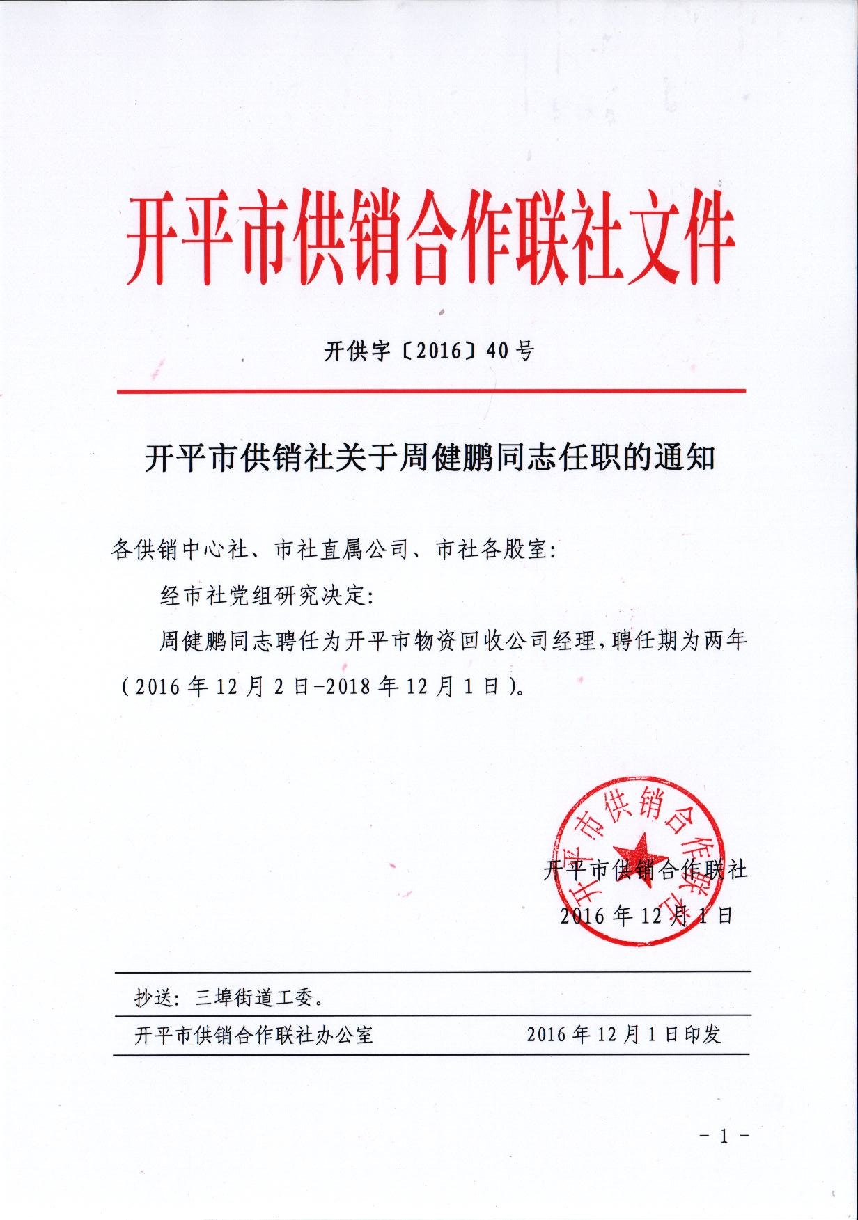 開供字〔2016〕40號開平市供銷社關(guān)于周健鵬同志任職的通知