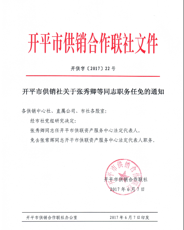 開供字【2017】22號(hào)開平市供銷社關(guān)于張秀卿等同志職務(wù)任免的通知