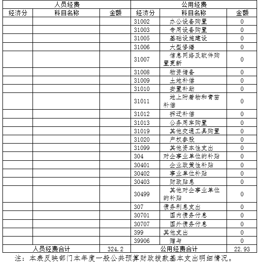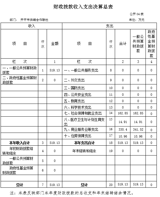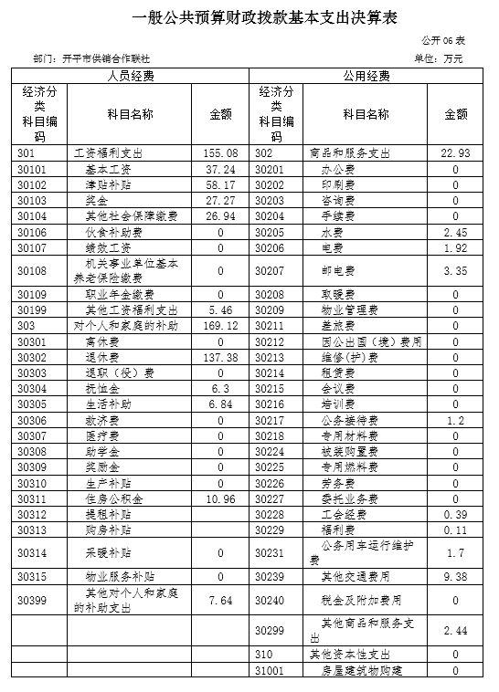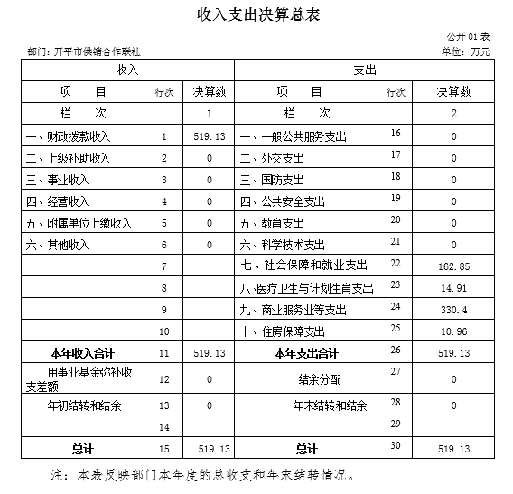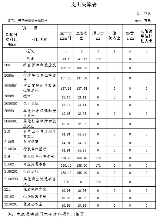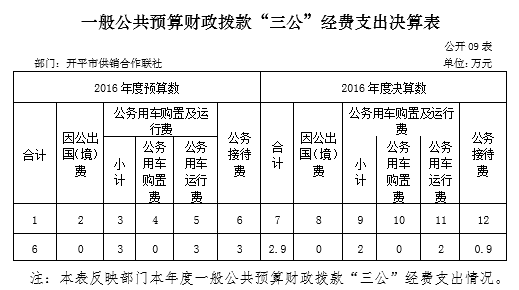2016年 開平市供銷合作聯(lián)社 部門決算 目 錄 第一部分 開平市供銷合作聯(lián)社概況 一、 部門職責(zé) 二、 機構(gòu)設(shè)置 第二部分 2016年部門決算表 一、收入支出決算總表 二、收入決算表 三、支出決算表 四、財政撥款收入支出決算總表 五、一般公共預(yù)算財政撥款支出決算表 六、一般公共預(yù)算財政撥款基本支出決算表 七、財政撥款“三公”經(jīng)費支出決算表 八、政府性基金預(yù)算財政撥款收入支出決算表 九、一般公共預(yù)算財政撥款“三公”經(jīng)費支出決算表 第三部分 2016年部門決算情況說明 第四部分 名詞解釋 第一部分 開平市供銷合作聯(lián)社概況 (一)部門主要職責(zé) 開平市供銷合作聯(lián)社是開平市供銷合作聯(lián)社(以下簡稱開平市供銷社)成立于1951年4月,是開平市供銷合作社的聯(lián)合組織,是開平市政府直屬的參照公務(wù)員法管理的正科級事業(yè)單位,屬全國供銷合作社系統(tǒng)的縣(市)級管理機構(gòu)。 開平市供銷合作聯(lián)社主要職能包括: 1.經(jīng)市政府授權(quán),對重要農(nóng)業(yè)生產(chǎn)資料、農(nóng)副產(chǎn)品、煙花爆竹的經(jīng)營進行組織、協(xié)調(diào)、管理,引導(dǎo)農(nóng)民發(fā)展商品生產(chǎn),促進城鄉(xiāng)物資交流。發(fā)展農(nóng)民合作經(jīng)濟組織,做好服務(wù)“三農(nóng)”工作。 2.受市政府主管部門的委托,對全市煙花爆竹經(jīng)營進行管理與指導(dǎo),定期對全市煙花爆竹安全經(jīng)營進行監(jiān)督與檢查。 3.受市政府主管部門委托授權(quán),管理廢舊物資回收市場秩序。 4.協(xié)調(diào)同有關(guān)部門的關(guān)系,組織開展對外經(jīng)濟、貿(mào)易、技術(shù)交流、促進供銷社經(jīng)濟發(fā)展。 5.管理社有資產(chǎn),行使本級社有資產(chǎn)出資人代表職能,維護供銷社的合法權(quán)益。 6.參與省供銷社和江門市供銷社的各項活動。 7.承辦市委、市政府和全國總社、省供銷社及江門市供銷社交辦的其他事項。 8.宣傳貫徹黨中央、國務(wù)院、省委、省政府、市委和市政府有關(guān)農(nóng)村工作的方針政策,加快供銷社的改革發(fā)展。 (二)機構(gòu)設(shè)置 按照部門決算編報要求,納入開平市供銷合作聯(lián)社2016年部門決算編報范圍的單位共1個,是社本級預(yù)算單位,沒有下屬預(yù)算單位。 第二部分 開平市供銷合作聯(lián)社2016年部門決算表 第三部分 2016年部門決算情況說明 一、2016年度收入支出決算總體情況說明 (一)年度收入總體情況 開平市供銷合作聯(lián)社2016年度總收入519.13萬元,其中本年收入519.13萬元。具體情況如下: 1.財政撥款收入519.13萬元,比上年決算數(shù)減少32.44萬元,下降5.88 %。主要原因:2016年死亡撫恤金經(jīng)費支出減少。 2.上級補助收入0萬元,與上年決算數(shù)持平。 3.事業(yè)收入0萬元,與上年決算數(shù)持平。 4.經(jīng)營收入0萬元,與上年決算數(shù)持平。 5.其他收入0萬元,與上年決算數(shù)持平。 (二)年度支出總體情況 開平市供銷合作聯(lián)社2016年度總支出519.13萬元,其中本年支出519.13萬元。具體情況如下: 1.社會保障和就業(yè)支出162.85萬元,主要用于在職人員社會保障繳費和離退休人員退休費、撫恤金,比上年決算數(shù)減少13.71萬元,下降7.77%,主要原因是2016年減少死亡撫恤金經(jīng)費支出。 2.醫(yī)療衛(wèi)生與計劃生育支出14.91萬元,主要支出項目有行政單位在職人員醫(yī)療費繳款,比上年決算數(shù)減少3.8 萬元,下降20.31%,主要原因是2016年在職人員的減少,繳納的醫(yī)療費減少。 3.商業(yè)服務(wù)業(yè)等支出330.4萬元,主要支出項目是商品和服務(wù)支出(包括辦公費、水費、電費、郵電費、公務(wù)接待費、公務(wù)用車運行維護費)和省級、江門市級、開平市級專項資金等,比上年決算數(shù)減少11.12萬元,下降3.26%,主要原因是三公經(jīng)費支出下降。 4.住房保障支出10.96萬元,主要支出項目是在職人員的住房公積金,比上年決算數(shù)減少3.83萬元,下降25.9%,主要原因是2016年在職人員的減少,繳納住房公積金減少。 二、2016年度財政撥款收入支出總表說明 (一)2016年度財政撥款收入說明 開平市供銷合作聯(lián)社2016年度財政撥款收入合計519.13萬元。其中:一般公共預(yù)算財政撥款收入519.13萬元,比年初預(yù)算數(shù)增加119.86元,增長30.02%;主要原因是在職人員社會保障繳費支出增加及省級、江門市級、開平市級新網(wǎng)工程、產(chǎn)銷對接專項資金增加;政府性基金預(yù)算財政撥款收入0萬元,與年初預(yù)算數(shù)持平。 (二)2016年度財政撥款支出說明 開平市供銷合作聯(lián)社2016年度財政撥款支出合計519.13萬元。其中:一般公共預(yù)算財政撥款支出519.13萬元,比年初預(yù)算數(shù)增加119.86萬元,增長30.02%;主要原因一是社會保障和就業(yè)支出增加30.42萬元,增長22.97%,主要原因是增加在職人員社會保障繳費。二是醫(yī)療衛(wèi)生與計劃生育支出減少2.98萬元,下降16.66%,主要原因是繳納的醫(yī)療費下降。三是商業(yè)服務(wù)業(yè)等支出增加177.42萬元,增長115.98%,主要原因是省級、江門市級、開平市級專項資金增加。四是住房保障支出減少2.51萬元,下降18.63%,主要原因是繳納住房公積金減少。 政府性基金預(yù)算財政撥款支出0萬元,與年初預(yù)算數(shù)持平。