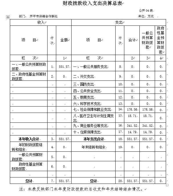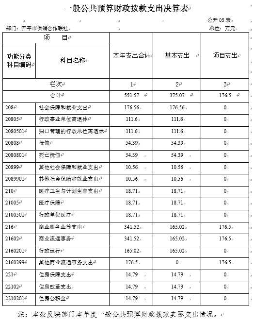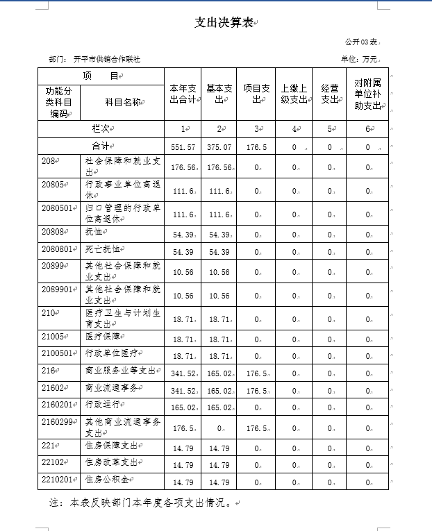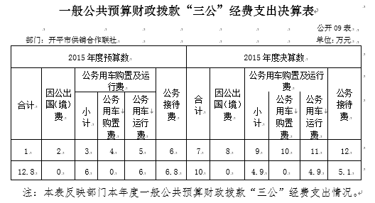 2015年 開平市供銷合作聯(lián)社 部門決算 目 錄 第一部分 開平市供銷合作聯(lián)社概況 一、 部門職責(zé) 二、 機(jī)構(gòu)設(shè)置 第二部分 2015年部門決算表 一、收入支出決算總表 二、收入決算表 三、支出決算表 四、財(cái)政撥款收入支出決算總表 五、一般公共預(yù)算財(cái)政撥款支出決算表 六、一般公共預(yù)算財(cái)政撥款基本支出決算表 七、財(cái)政撥款“三公”經(jīng)費(fèi)支出決算表 八、政府性基金預(yù)算財(cái)政撥款收入支出決算表 九、一般公共預(yù)算財(cái)政撥款“三公”經(jīng)費(fèi)支出決算表 第三部分 2015年部門決算情況說明 第四部分 名詞解釋 第一部分 開平市供銷合作聯(lián)社概況 (一)部門主要職責(zé) 開平市供銷合作聯(lián)社是開平市供銷合作聯(lián)社(以下簡稱開平市供銷社)成立于1951年4月,是開平市供銷合作社的聯(lián)合組織,是開平市政府直屬的參照公務(wù)員法管理的正科級(jí)事業(yè)單位,屬全國供銷合作社系統(tǒng)的縣(市)級(jí)管理機(jī)構(gòu)。 開平市供銷合作聯(lián)社主要職能包括: 1.經(jīng)市政府授權(quán),對(duì)重要農(nóng)業(yè)生產(chǎn)資料、農(nóng)副產(chǎn)品、煙花爆竹的經(jīng)營進(jìn)行組織、協(xié)調(diào)、管理,引導(dǎo)農(nóng)民發(fā)展商品生產(chǎn),促進(jìn)城鄉(xiāng)物資交流。發(fā)展農(nóng)民合作經(jīng)濟(jì)組織,做好服務(wù)“三農(nóng)”工作。 2.受市政府主管部門的委托,對(duì)全市煙花爆竹經(jīng)營進(jìn)行管理與指導(dǎo),定期對(duì)全市煙花爆竹安全經(jīng)營進(jìn)行監(jiān)督與檢查。 3.受市政府主管部門委托授權(quán),管理廢舊物資回收市場秩序。 4.協(xié)調(diào)同有關(guān)部門的關(guān)系,組織開展對(duì)外經(jīng)濟(jì)、貿(mào)易、技術(shù)交流、促進(jìn)供銷社經(jīng)濟(jì)發(fā)展。 5.管理社有資產(chǎn),行使本級(jí)社有資產(chǎn)出資人代表職能,維護(hù)供銷社的合法權(quán)益。 6.參與省供銷社和江門市供銷社的各項(xiàng)活動(dòng)。 7.承辦市委、市政府和全國總社、省供銷社及江門市供銷社交辦的其他事項(xiàng)。 8.宣傳貫徹黨中央、國務(wù)院、省委、省政府、市委和市政府有關(guān)農(nóng)村工作的方針政策,加快供銷社的改革發(fā)展。 (二)機(jī)構(gòu)設(shè)置 按照部門決算編報(bào)要求,納入開平市供銷合作聯(lián)社2016年部門決算編報(bào)范圍的單位共1個(gè),是社本級(jí)預(yù)算單位,沒有下屬預(yù)算單位。 第二部分 開平市供銷合作聯(lián)社2015年部門決算表 第三部分 2015年部門決算情況說明 一、2015年度收入支出決算總體情況說明 (一)年度收入總體情況 開平市供銷合作聯(lián)社2015年度總收入551.57萬元,其中本年收入551.57萬元。具體情況如下: 1.財(cái)政撥款收入551.57萬元,比上年決算數(shù)增加203.08萬元,增長58.27 %。主要原因:一是2015年公務(wù)用車改革,增加了公務(wù)交通補(bǔ)貼和死亡撫恤金等經(jīng)費(fèi)支出;二是得到省級(jí)、江門市級(jí)、開平市級(jí)新網(wǎng)工程、產(chǎn)銷對(duì)接專項(xiàng)資金扶持金額增加176.5萬元。 2.上級(jí)補(bǔ)助收入0萬元,與上年決算數(shù)持平。 3.事業(yè)收入0萬元,與上年決算數(shù)持平。 4.經(jīng)營收入0萬元,與上年決算數(shù)持平。 5.其他收入0萬元,與上年決算數(shù)持平。 (二)年度支出總體情況 開平市供銷合作聯(lián)社2015年度總支出551.57萬元,其中本年支出551.57萬元。具體情況如下: 1.社會(huì)保障和就業(yè)支出176.56萬元,主要用于在職人員社會(huì)保障繳費(fèi)和離退休人員退休費(fèi)、撫恤金,比上年決算數(shù)增加56.75萬元,增長47.37%,主要原因是2015年增加支出離退休人員的死亡撫恤金。 2.醫(yī)療衛(wèi)生與計(jì)劃生育支出18.71萬元,主要支出項(xiàng)目有行政單位在職人員醫(yī)療費(fèi)繳款,比上年決算數(shù)增加1.69 萬元,增長9.9%,主要原因是2015年在職人員的工資增長,繳費(fèi)基數(shù)增大,繳納的醫(yī)療費(fèi)增加。 3.商業(yè)服務(wù)業(yè)等支出341.52萬元,主要支出項(xiàng)目是商品和服務(wù)支出(包括辦公費(fèi)、水費(fèi)、電費(fèi)、郵電費(fèi)、公務(wù)接待費(fèi)、公務(wù)用車運(yùn)行維護(hù)費(fèi))和省級(jí)、江門市級(jí)、開平市級(jí)專項(xiàng)資金等,比上年決算數(shù)增加143.48萬元,增長72.45%,主要原因是省級(jí)、江門市級(jí)、開平市級(jí)專項(xiàng)資金增加。 4.住房保障支出14.79萬元,主要支出項(xiàng)目是在職人員的住房公積金,比上年決算數(shù)增加1.17萬元,增長8.6%,主要原因是2015年在職人員的工資增長,繳費(fèi)基數(shù)增大,繳納住房公積金增加。 二、2015年度財(cái)政撥款收入支出總表說明 (一)2015年度財(cái)政撥款收入說明 開平市供銷合作聯(lián)社2015年度財(cái)政撥款收入合計(jì)551.57萬元。其中:一般公共預(yù)算財(cái)政撥款收入551.57萬元,比年初預(yù)算數(shù)增加148.6萬元,增長36.88%;主要原因是公務(wù)用車改革,增加了公務(wù)交通補(bǔ)貼和死亡撫恤金等經(jīng)費(fèi)支出,以及增加省級(jí)、江門市級(jí)、開平市級(jí)新網(wǎng)工程、產(chǎn)銷對(duì)接專項(xiàng)資金;政府性基金預(yù)算財(cái)政撥款收入0萬元,與年初預(yù)算數(shù)持平。 (