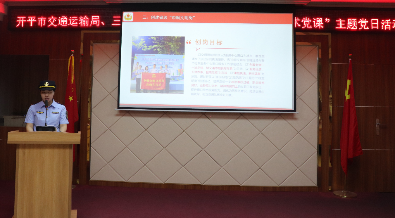 隨后,由市交通運(yùn)輸局女子執(zhí)法隊(duì)隊(duì)員張雅怡同志講述了“巾幗文明崗”的創(chuàng)崗背景,講述開(kāi)平市交通巾幗們立足本職崗位,爭(zhēng)先創(chuàng)優(yōu)等工作中的感人事跡,展現(xiàn)巾幗“交通藍(lán)”的忘我奉獻(xiàn)、勇于擔(dān)當(dāng)、開(kāi)拓創(chuàng)新、砥礪深耕的新時(shí)代女性精神風(fēng)貌。