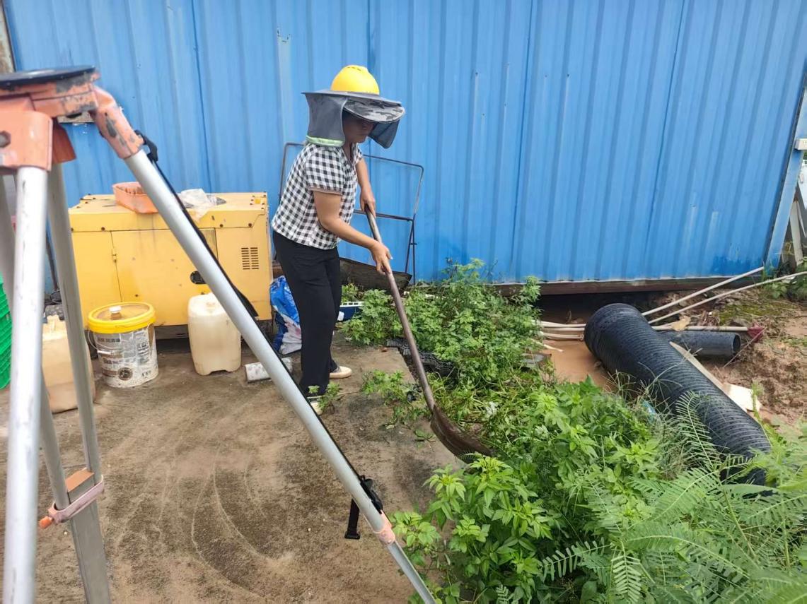 開平市縣道紅龍線(梁金山旅游公路及金章大道段)工程—金章大道段工作人員在對工人生活區(qū)進(jìn)行雜草及積水清理