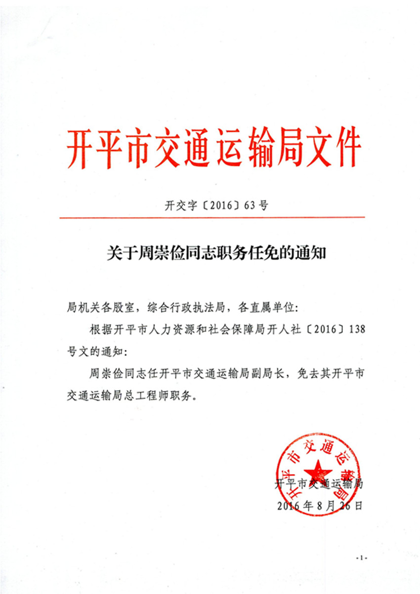 關于周崇儉同志職務任免的通知