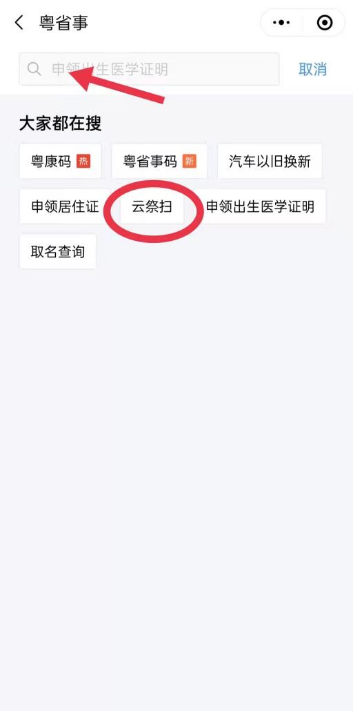 1.進(jìn)入粵省事小程序,然后直接搜索“云祭掃服務(wù)”或者看“大家都在搜”一欄有無(wú)顯示“云祭掃頁(yè)面”,如果有的話可以直接點(diǎn)擊進(jìn)入。