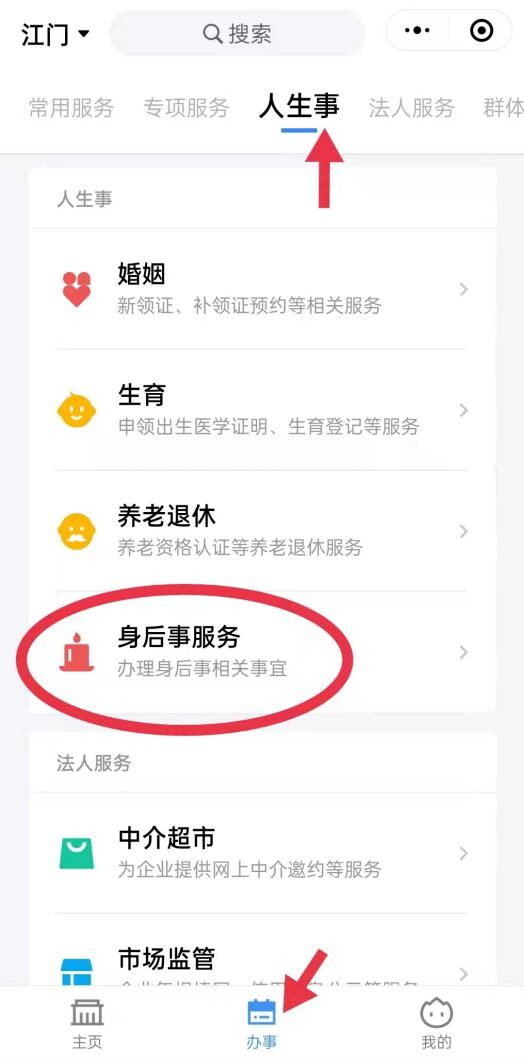 2.進(jìn)入粵省事小程序,點(diǎn)擊下方的“辦事”-“人生事”-“身后事服務(wù)”-點(diǎn)擊“云祭掃”服務(wù)。
