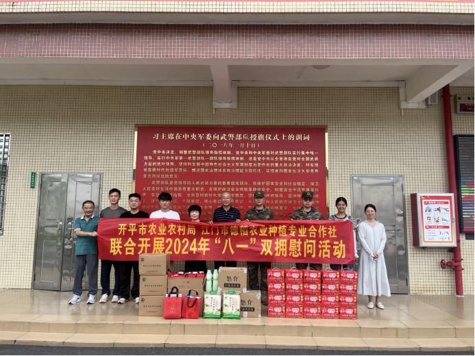 值此中國人民解放軍建軍97周年來臨之際,為進(jìn)一步弘揚(yáng)擁軍優(yōu)屬、擁政愛民的光榮傳統(tǒng),加強(qiáng)軍政軍民團(tuán)結(jié),開平市農(nóng)業(yè)農(nóng)村局聯(lián)合農(nóng)業(yè)經(jīng)營(yíng)主體開展2024年“八一”雙擁慰問活動(dòng),向駐地部隊(duì)官兵致以節(jié)日的問候和崇高的敬意。 7月30日,謝沃豪四級(jí)調(diào)研員帶領(lǐng)農(nóng)業(yè)農(nóng)村局相關(guān)同志,攜帶精心準(zhǔn)備的慰問品,前往中國人民武裝警察部隊(duì)江門支隊(duì)執(zhí)勤二大隊(duì)開平中隊(duì)進(jìn)行慰問,充分表達(dá)了市農(nóng)業(yè)農(nóng)村局對(duì)駐地官兵們的關(guān)懷和支持。 在武警部隊(duì),市農(nóng)業(yè)農(nóng)村局的同志與部隊(duì)官兵進(jìn)行了座談。雙方就部隊(duì)建設(shè)、后勤保障、部隊(duì)生活等方面進(jìn)行了親切交流,對(duì)駐地官兵長(zhǎng)期以來支持保障開平各項(xiàng)事業(yè)發(fā)展所作出的突出貢獻(xiàn)表示衷心感謝,未來農(nóng)業(yè)農(nóng)村局將加強(qiáng)與駐地官兵們的文體交流。 此次八一建軍節(jié)慰問活動(dòng),不僅加深了市農(nóng)業(yè)農(nóng)村局與駐地部隊(duì)之間的友誼與聯(lián)系,更進(jìn)一步鞏固了軍政軍民團(tuán)結(jié)的良好局面。市農(nóng)業(yè)農(nóng)村局表示,將繼續(xù)全力做好雙擁工作,支持保障部隊(duì)建設(shè),不斷鞏固軍地共建,為全市高質(zhì)量發(fā)展提供堅(jiān)實(shí)的保障。同時(shí),我局也將積極發(fā)揮自身優(yōu)勢(shì),加強(qiáng)與駐地官兵們的溝通交流,攜手譜寫新時(shí)代軍民融合發(fā)展,共同完成黨和人民賦予的新時(shí)代使命任務(wù)。
