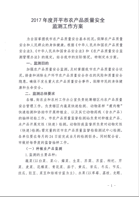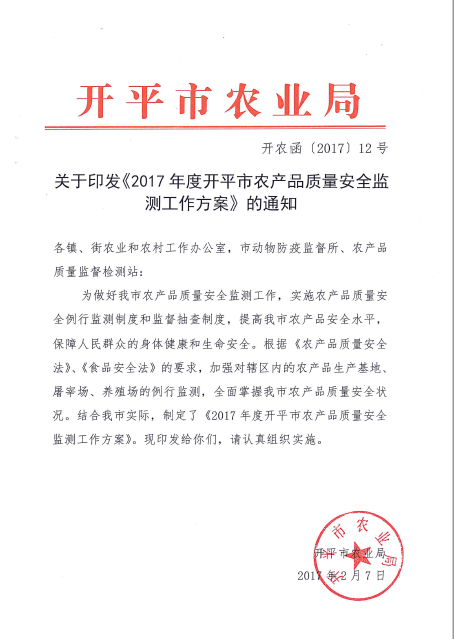關于印發(fā)《2017年度開平市農(nóng)產(chǎn)品質(zhì)量安全監(jiān)測方案》的通知