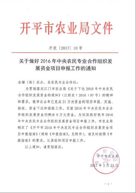 附件下載:附件:開(kāi)平市2016年中央農(nóng)民專業(yè)合作組織發(fā)展資金項(xiàng)目申報(bào)指南 附件下載:附件一:農(nóng)業(yè)財(cái)政資金項(xiàng)目申報(bào)標(biāo)準(zhǔn)文本 附件下載:附件二:項(xiàng)目實(shí)施方案