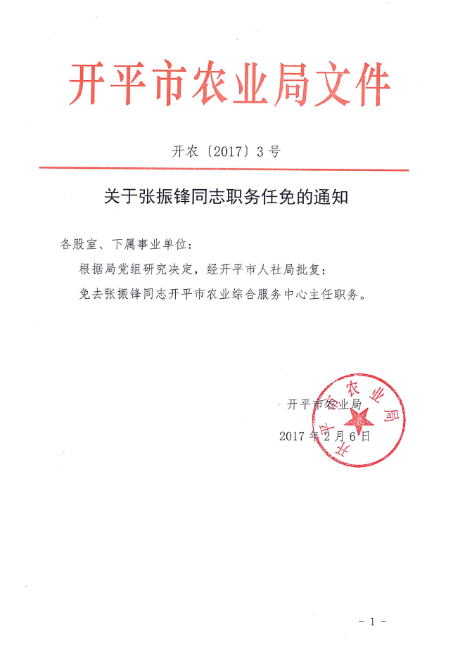 關(guān)于張振鋒同志職務(wù)任免的通知(開(kāi)農(nóng)【2017】3號(hào))
