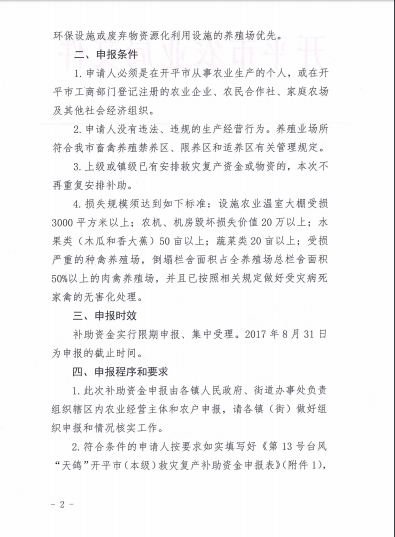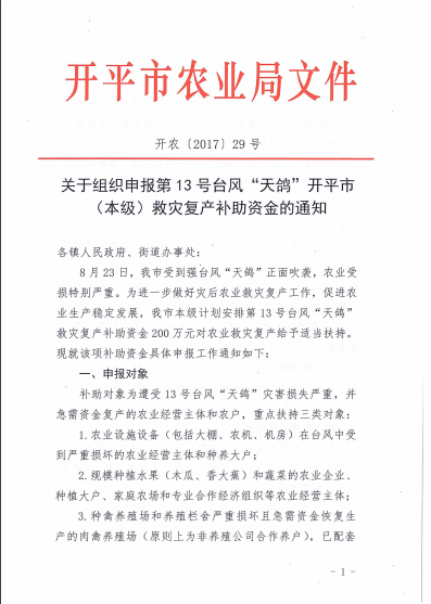 關(guān)于組織申報第13號臺風“天鴿”開平市(本級)救災(zāi)復(fù)產(chǎn)補助資金的通知