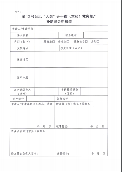 第13號臺風“天鴿”開平市(本級)救災(zāi)復(fù)產(chǎn)補助資金申報表