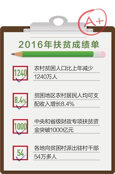 制圖:沈亦伶 記者28日從國務(wù)院扶貧辦媒體通氣會上獲悉:2016年是全面貫徹落實中央扶貧開發(fā)工作會議精神、打贏脫貧攻堅戰(zhàn)的首戰(zhàn)之年,按照每人每年2300元(2010年不變價)的農(nóng)村貧困標(biāo)準(zhǔn)計算,2016年農(nóng)村貧困人口4335萬人,比上年減少1240萬人,超額完成1000萬人的目標(biāo)任務(wù)。 2016年,我國扶貧投入力度空前。財力投入上,中央和省級財政專項扶貧資金首次突破1000億元,其中中央財政667億元,同比增長43.4%。792個貧困縣啟動實施涉農(nóng)資金整合試點,實際整合到位資金約2300億元,惠及建檔立卡貧困人口3000多萬人。各類金融機(jī)構(gòu)加大扶貧支持力度,到2016年底,累計發(fā)放扶貧小額貸款2833億元,全國共有801萬貧困戶受益。人力投入上,各地共向貧困村選派駐村工作隊12.8萬個,派出駐村干部54萬多人。全國選派18.8萬名優(yōu)秀干部到貧困村和基層黨組織薄弱村擔(dān)任第一書記,提升帶動群眾脫貧能力。 2016年我國貧困地區(qū)人民生活水平不斷提高。貧困地區(qū)農(nóng)村居民人均可支配收入8452元,比上年實際增長8.4%,增速比全部農(nóng)村居民收入快2.2個百分點。